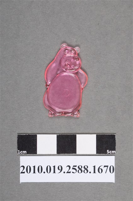1.本物件為站立河馬型尪仔仙。硬質塑膠材質,扁平,單一粉紅色,雙面浮雕圖案,兩面圖案相同。圖案為擬人化的站立河馬,有2個耳朵,嘴巴張開,有2個圓圓的大鼻孔和大肚子,雙手叉腰。2.尪仔仙尺寸大致可分成小、中、大型,小型約長2-5公分,中型約長8-15公分,顏色以單色為主。有些大型的則可長達30公分左右,以菩薩、神仙和民間傳說故事人物等造型為主,塗上金銀紅黃彩漆等亮色。1960、70年代的尪仔仙多以民間傳說故事、歌仔戲、布袋戲人物為造型。1980年代改以卡通、電玩、漫畫人物造型為主。常見玩法之一為兩人(或多人)各持一只尪仔仙,輪流用手指彈射,看誰的尪仔仙先疊在對方上面,便可贏得對方用來對戰或是約定的尪仔仙。
