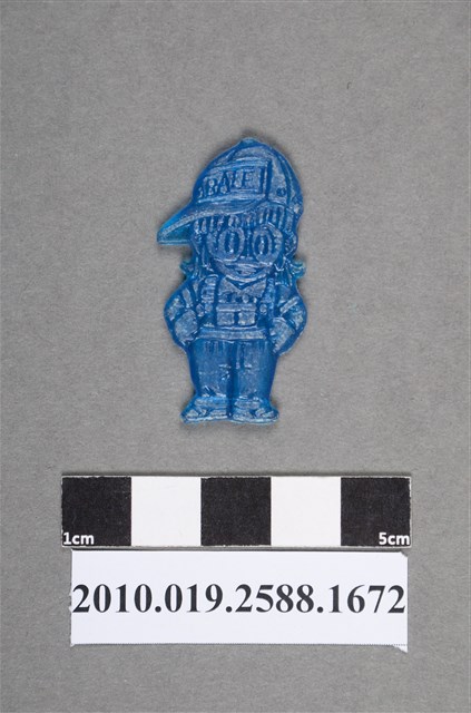 1.本物件為漫畫怪博士與機器娃娃之阿拉蕾(丁小雨)尪仔仙。硬質塑膠材質,扁平,單一藍色,雙面浮雕圖案,兩面圖案相同。圖案為小女孩人型,張嘴笑,戴著帽子和眼鏡,帽上有「ARALE」字樣,穿著吊帶褲,雙手插在口袋。