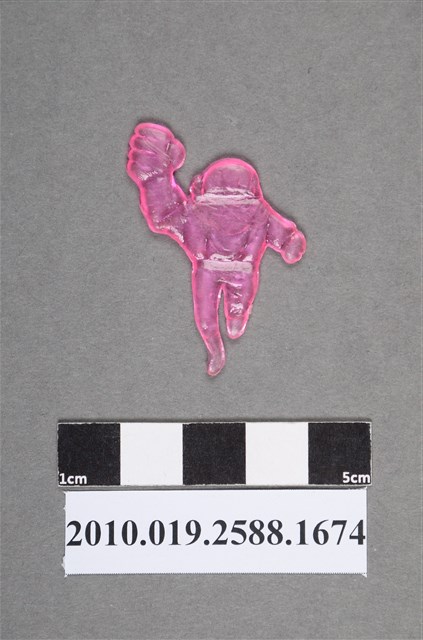 1.本物件為握拳人型尪仔仙。硬質塑膠材質,扁平,單一紅色,雙面浮雕圖案。正面圖案為往前衝的男性形象,其戴有頭盔,左手握拳伸向前,右手握拳往後擺,雙腳呈跑步姿勢。2.尪仔仙尺寸大致可分成小、中、大型,小型約長2-5公分,中型約長8-15公分,顏色以單色為主。有些大型的則可長達30公分左右,以菩薩、神仙和民間傳說故事人物等造型為主,塗上金銀紅黃彩漆等亮色。1960、70年代的尪仔仙多以民間傳說故事、歌仔戲、布袋戲人物為造型。1980年代改以卡通、電玩、漫畫人物造型為主。常見玩法之一為兩人(或多人)各持一只尪仔仙,輪流用手指彈射,看誰的尪仔仙先疊在對方上面,便可贏得對方用來對戰或是約定的尪仔仙。