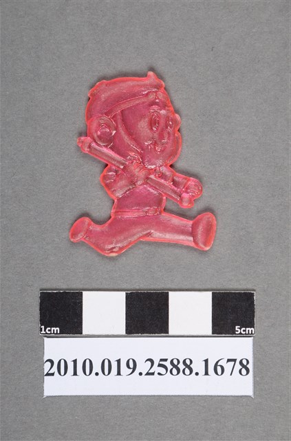 1.本物件為孫悟空尪仔仙。硬質塑膠材質,扁平,單一紅色,雙面浮雕圖案,兩面圖案相同。圖案為Q版頭戴金箍的孫悟空,肩上扛著金箍棒,呈跑步姿勢。孫悟空為西遊記之角色。