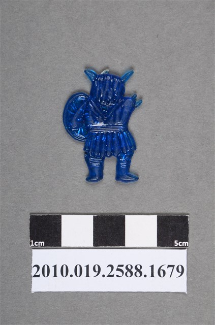 1.本物件為持盾人型尪仔仙。硬質塑膠材質,扁平,單一藍色,雙面浮雕圖案。正面圖案為站立人型,頭上有2隻角,肩膀上亦有凸出2角,手裡拿著盾牌,下半身為裙狀服飾。2.尪仔仙尺寸大致可分成小、中、大型,小型約長2-5公分,中型約長8-15公分,顏色以單色為主。有些大型的則可長達30公分左右,以菩薩、神仙和民間傳說故事人物等造型為主,塗上金銀紅黃彩漆等亮色。1960、70年代的尪仔仙多以民間傳說故事、歌仔戲、布袋戲人物為造型。1980年代改以卡通、電玩、漫畫人物造型為主。常見玩法之一為兩人(或多人)各持一只尪仔仙,輪流用手指彈射,看誰的尪仔仙先疊在對方上面,便可贏得對方用來對戰或是約定的尪仔仙。