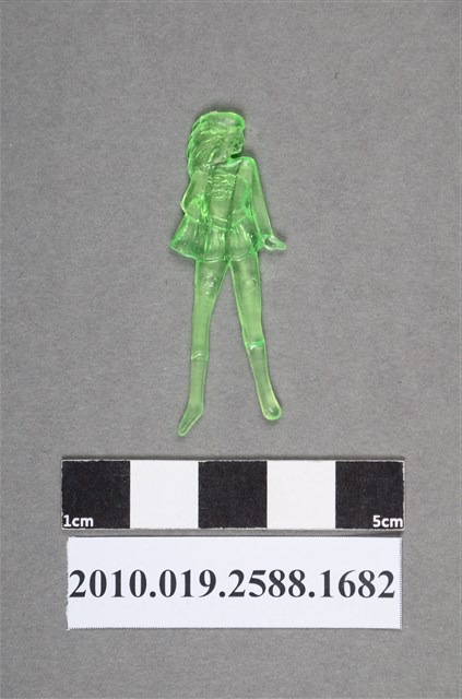 1.本物件為披風人型尪仔仙。硬質塑膠材質,扁平,單一綠色,雙面浮雕圖案。正面圖案為站立的女性,臉側向一邊,穿有披風。胸前有S字,左手撐腰,右手垂放,為女超人形象。2.尪仔仙尺寸大致可分成小、中、大型,小型約長2-5公分,中型約長8-15公分,顏色以單色為主。有些大型的則可長達30公分左右,以菩薩、神仙和民間傳說故事人物等造型為主,塗上金銀紅黃彩漆等亮色。1960、70年代的尪仔仙多以民間傳說故事、歌仔戲、布袋戲人物為造型。1980年代改以卡通、電玩、漫畫人物造型為主。常見玩法之一為兩人(或多人)各持一只尪仔仙,輪流用手指彈射,看誰的尪仔仙先疊在對方上面,便可贏得對方用來對戰或是約定的尪仔仙。