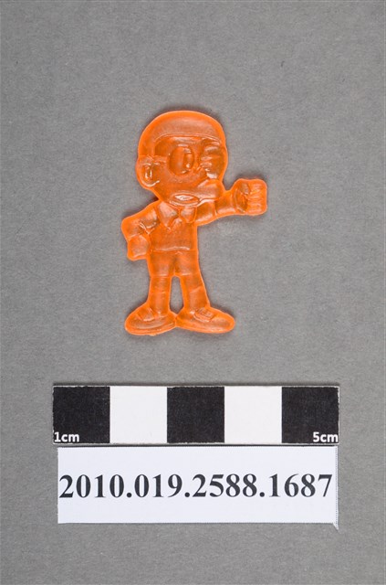 1.本物件為卡通哆啦A夢(小叮噹)之大雄(野比大雄)尪仔仙。硬質塑膠材質,扁平,單一橘色,雙面浮雕圖案,兩面圖案相同。圖案為戴著眼鏡的大雄,一眼張開,一眼瞇著,嘴巴嘟起來,頸部綁有蝴蝶結,穿短褲。其為站立姿勢,一手伸出握拳,另一手放腰間。