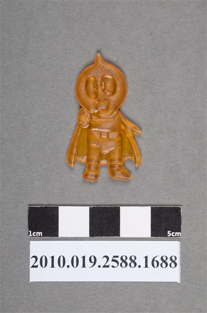 1.本物件為披風人型尪仔仙。硬質塑膠材質,扁平,單一橙色,雙面浮雕圖案,兩面圖案相同。圖案為戴著面具型頭盔遮住全頭部,頭盔正中間有尖角,服裝有披風和腰帶之站立人型。其眼睛呈橢圓形,一手往前指,一手垂放。2.尪仔仙尺寸大致可分成小、中、大型,小型約長2-5公分,中型約長8-15公分,顏色以單色為主。有些大型的則可長達30公分左右,以菩薩、神仙和民間傳說故事人物等造型為主,塗上金銀紅黃彩漆等亮色。1960、70年代的尪仔仙多以民間傳說故事、歌仔戲、布袋戲人物為造型。1980年代改以卡通、電玩、漫畫人物造型為主。常見玩法之一為兩人(或多人)各持一只尪仔仙,輪流用手指彈射,看誰的尪仔仙先疊在對方上面,便可贏得對方用來對戰或是約定的尪仔仙。