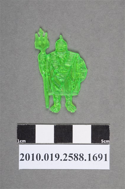 1.本物件為持三叉戟人型尪仔仙。硬質塑膠材質,扁平,單一綠色,雙面浮雕圖案。正面圖案為站立人型,面貌、手指與腳趾則異於常人,頭頂有凸出之尖形物,穿有披風,左手拿三叉戟,右手臂上掛有盾牌,手指長且尖,腳趾僅有3趾。2.尪仔仙尺寸大致可分成小、中、大型,小型約長2-5公分,中型約長8-15公分,顏色以單色為主。有些大型的則可長達30公分左右,以菩薩、神仙和民間傳說故事人物等造型為主,塗上金銀紅黃彩漆等亮色。1960、70年代的尪仔仙多以民間傳說故事、歌仔戲、布袋戲人物為造型。1980年代改以卡通、電玩、漫畫人物造型為主。常見玩法之一為兩人(或多人)各持一只尪仔仙,輪流用手指彈射,看誰的尪仔仙先疊在對方上面,便可贏得對方用來對戰或是約定的尪仔仙。