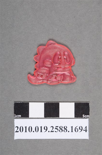 1.本物件為電玩泡泡龍的同名尪仔仙。硬質塑膠材質,扁平,單一粉紅色,雙面浮雕圖案,兩面圖案相同。圖案為坐著的恐龍,可見腳底,背上有三角形骨質板,延伸至尾巴,嘴巴微開,有門牙,表情呈委屈貌。