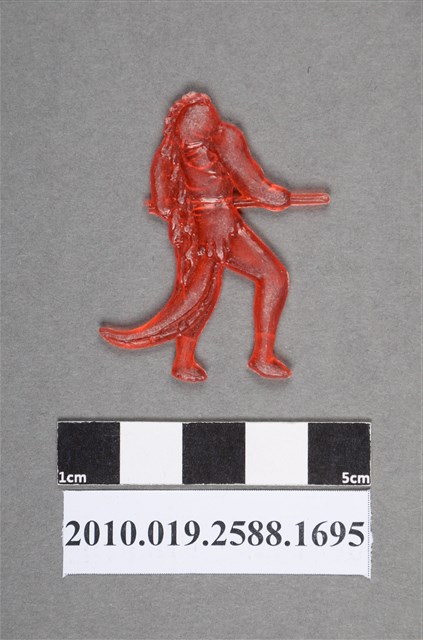1.本物件為持棍恐龍型尪仔仙。硬質塑膠材質,扁平,單一紅色,雙面浮雕圖案。正面圖案為擬人化的恐龍,頭部為爬蟲類動物的頭型,身穿衣服,以雙腳站立,雙手拿著棍子,有長尾巴。