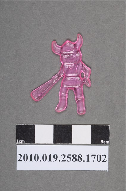 1.本物件為卡通北海小英雄之小威尪仔仙。硬質塑膠材質,扁平,單一粉紅色,雙面浮雕圖案。正面圖案為頭戴維京人帽子,腳穿靴子,左手拿棒子之男孩貌。