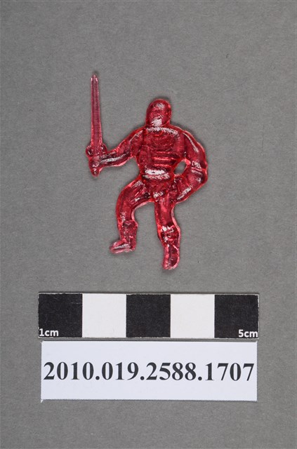 1.本物件為持劍人型尪仔仙。硬質塑膠材質,扁平,單一紅色,雙面浮雕圖案。正面圖案為站立的男性人型,可見其手臂和大腿的肌肉線條,穿有靴子,左手拿著劍型武器,右手握拳。2.尪仔仙尺寸大致可分成小、中、大型,小型約長2-5公分,中型約長8-15公分,顏色以單色為主。有些大型的則可長達30公分左右,以菩薩、神仙和民間傳說故事人物等造型為主,塗上金銀紅黃彩漆等亮色。1960、70年代的尪仔仙多以民間傳說故事、歌仔戲、布袋戲人物為造型。1980年代改以卡通、電玩、漫畫人物造型為主。常見玩法之一為兩人(或多人)各持一只尪仔仙,輪流用手指彈射,看誰的尪仔仙先疊在對方上面,便可贏得對方用來對戰或是約定的尪仔仙。