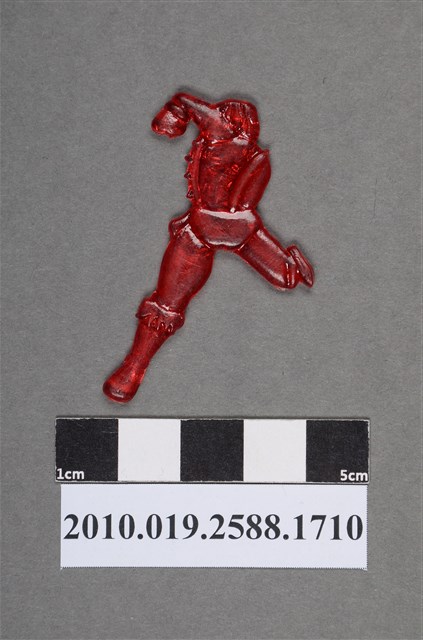 1.本物件為握拳人型尪仔仙。硬質塑膠材質,扁平,單一紅色,雙面浮雕圖案。正面圖案為頭戴防毒面具形式面罩的人,身上有2條帶子,帶子上有鉚釘裝飾,穿著靴子。其雙手握拳,右拳往前擊,左腳往前伸,右腳往後踢。2.尪仔仙尺寸大致可分成小、中、大型,小型約長2-5公分,中型約長8-15公分,顏色以單色為主。有些大型的則可長達30公分左右,以菩薩、神仙和民間傳說故事人物等造型為主,塗上金銀紅黃彩漆等亮色。1960、70年代的尪仔仙多以民間傳說故事、歌仔戲、布袋戲人物為造型。1980年代改以卡通、電玩、漫畫人物造型為主。常見玩法之一為兩人(或多人)各持一只尪仔仙,輪流用手指彈射,看誰的尪仔仙先疊在對方上面,便可贏得對方用來對戰或是約定的尪仔仙。