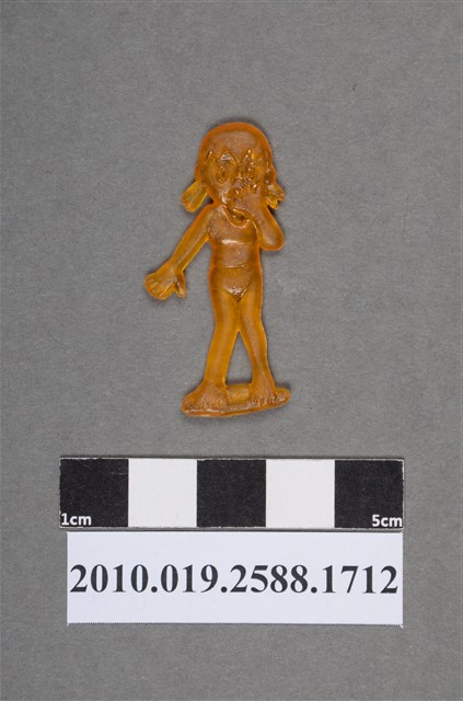 1.本物件為卡通哆啦A夢(小叮噹)之靜香尪仔仙。硬質塑膠材質,扁平,單一橙色,雙面浮雕圖案,兩面圖案相同。圖案為綁著2個馬尾的靜香站立,眼睛睜大,身穿內衣內褲,一手摀住嘴巴,一手向旁邊伸,呈驚訝貌。