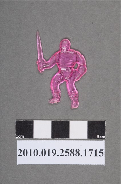1.本物件為持劍人型尪仔仙。硬質塑膠材質,扁平,單一粉紅色,雙面浮雕圖案。正面圖案為站立的男性人型,可見其手臂和大腿的肌肉線條,穿有靴子,左手拿著劍型武器,右手握拳。2.尪仔仙尺寸大致可分成小、中、大型,小型約長2-5公分,中型約長8-15公分,顏色以單色為主。有些大型的則可長達30公分左右,以菩薩、神仙和民間傳說故事人物等造型為主,塗上金銀紅黃彩漆等亮色。1960、70年代的尪仔仙多以民間傳說故事、歌仔戲、布袋戲人物為造型。1980年代改以卡通、電玩、漫畫人物造型為主。常見玩法之一為兩人(或多人)各持一只尪仔仙,輪流用手指彈射,看誰的尪仔仙先疊在對方上面,便可贏得對方用來對戰或是約定的尪仔仙。