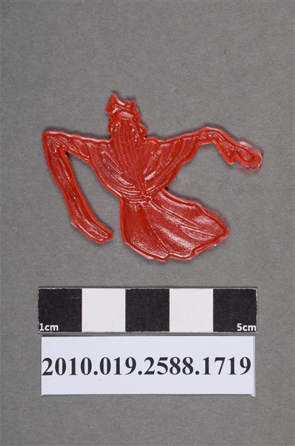 1.本物件為古代裙裝人型尪仔仙。硬質塑膠材質,扁平,單一橘紅色,雙面浮雕圖案。正面圖案為飛天仙女的形象,其髮型上有裝飾,著古代裙裝,雙手往左右打開撐開帔帛,裙底有飄動的感覺。2.尪仔仙尺寸大致可分成小、中、大型,小型約長2-5公分,中型約長8-15公分,顏色以單色為主。有些大型的則可長達30公分左右,以菩薩、神仙和民間傳說故事人物等造型為主,塗上金銀紅黃彩漆等亮色。1960、70年代的尪仔仙多以民間傳說故事、歌仔戲、布袋戲人物為造型。1980年代改以卡通、電玩、漫畫人物造型為主。常見玩法之一為兩人(或多人)各持一只尪仔仙,輪流用手指彈射,看誰的尪仔仙先疊在對方上面,便可贏得對方用來對戰或是約定的尪仔仙。
