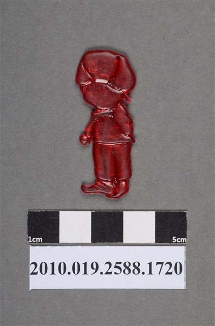 1.本物件為中東服裝人型尪仔仙。硬質塑膠材質,扁平,單一紅色,雙面浮雕圖案。正面圖案為中東服裝打扮的男孩,頭上包有包巾,包巾中間有裝飾,張嘴而笑,身上穿有背心,腳穿尖頭鞋。2.尪仔仙尺寸大致可分成小、中、大型,小型約長2-5公分,中型約長8-15公分,顏色以單色為主。有些大型的則可長達30公分左右,以菩薩、神仙和民間傳說故事人物等造型為主,塗上金銀紅黃彩漆等亮色。1960、70年代的尪仔仙多以民間傳說故事、歌仔戲、布袋戲人物為造型。1980年代改以卡通、電玩、漫畫人物造型為主。常見玩法之一為兩人(或多人)各持一只尪仔仙,輪流用手指彈射,看誰的尪仔仙先疊在對方上面,便可贏得對方用來對戰或是約定的尪仔仙。