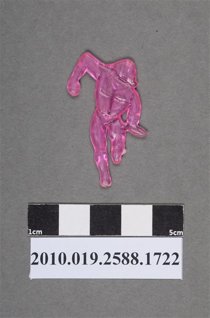 1.本物件為伸手人型尪仔仙。硬質塑膠材質,扁平,單一粉紅色,雙面浮雕圖案。正面圖案為彎腰跑步之人型,可見腿部肌肉線條,戴著頭盔,左手往後擺,右手往下伸,有抓取物品之貌。2.尪仔仙尺寸大致可分成小、中、大型,小型約長2-5公分,中型約長8-15公分,顏色以單色為主。有些大型的則可長達30公分左右,以菩薩、神仙和民間傳說故事人物等造型為主,塗上金銀紅黃彩漆等亮色。1960、70年代的尪仔仙多以民間傳說故事、歌仔戲、布袋戲人物為造型。1980年代改以卡通、電玩、漫畫人物造型為主。常見玩法之一為兩人(或多人)各持一只尪仔仙,輪流用手指彈射,看誰的尪仔仙先疊在對方上面,便可贏得對方用來對戰或是約定的尪仔仙。