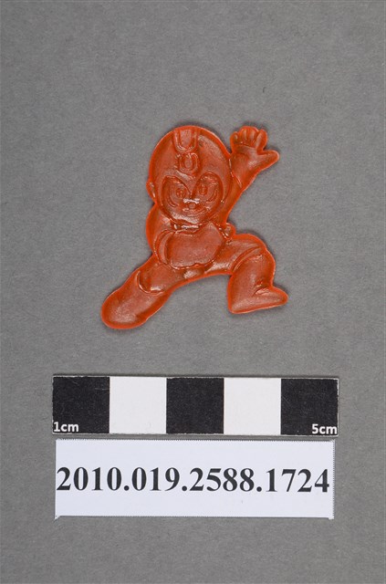 1.本物件為電玩洛克人之洛克人尪仔仙。硬質塑膠材質,扁平,單一橘色,雙面浮雕圖案,兩面圖案相同。圖案為戴著頭盔的洛克人呈戰鬥姿勢,一手向後伸,一手握拳在胸前,一腳向後伸,一腳膝蓋往前彎曲。