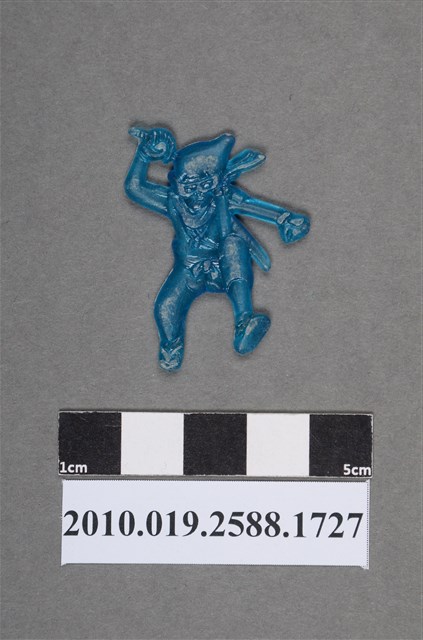 1.本物件為持劍人型尪仔仙。硬質塑膠材質,扁平,單一藍色,雙面浮雕圖案,兩面圖案相同。圖案為跳躍起來的男性,其髮型偏向一側,戴有護目鏡,穿著夾腳拖鞋。其一手抓著長劍要由背後往前揮,另一手握拳,一腳往後蹬,另一腳膝蓋向前彎曲。2.尪仔仙尺寸大致可分成小、中、大型,小型約長2-5公分,中型約長8-15公分,顏色以單色為主。有些大型的則可長達30公分左右,以菩薩、神仙和民間傳說故事人物等造型為主,塗上金銀紅黃彩漆等亮色。1960、70年代的尪仔仙多以民間傳說故事、歌仔戲、布袋戲人物為造型。1980年代改以卡通、電玩、漫畫人物造型為主。常見玩法之一為兩人(或多人)各持一只尪仔仙,輪流用手指彈射,看誰的尪仔仙先疊在對方上面,便可贏得對方用來對戰或是約定的尪仔仙。