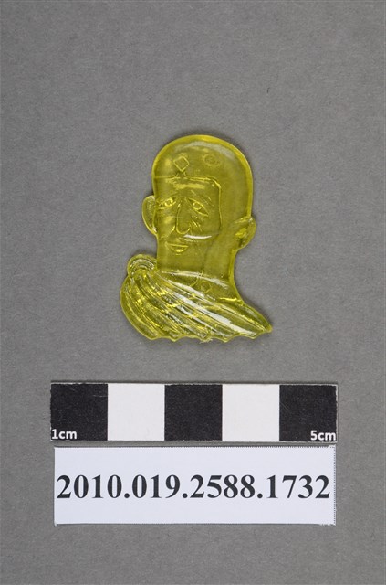 1.本物件為頭盔頭像尪仔仙。硬質塑膠材質,扁平,單一黃色,雙面浮雕圖案。正面圖案為戴著頭盔的人型頭像,頭盔正中間有菱形,耳朵在頭盔外,眼角下垂,長下巴,下巴底下有一部分服裝裝飾。2.尪仔仙尺寸大致可分成小、中、大型,小型約長2-5公分,中型約長8-15公分,顏色以單色為主。有些大型的則可長達30公分左右,以菩薩、神仙和民間傳說故事人物等造型為主,塗上金銀紅黃彩漆等亮色。1960、70年代的尪仔仙多以民間傳說故事、歌仔戲、布袋戲人物為造型。1980年代改以卡通、電玩、漫畫人物造型為主。常見玩法之一為兩人(或多人)各持一只尪仔仙,輪流用手指彈射,看誰的尪仔仙先疊在對方上面,便可贏得對方用來對戰或是約定的尪仔仙。