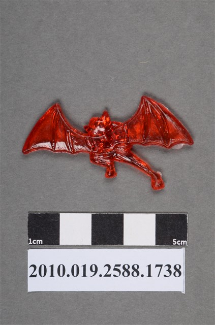 1.本物件為展翅蝙蝠型尪仔仙。硬質塑膠材質,扁平,單一紅色,雙面浮雕圖案。正面圖案為擬人化的蝙蝠,頭部兩旁有尖形大耳,雙腳如人足,背上有翅膀,翅膀往外張開,可見骨架。