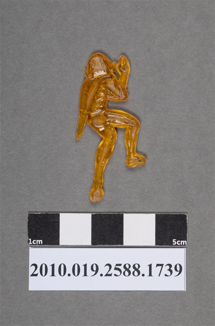 1.本物件為雙手交叉人型尪仔仙。硬質塑膠材質,扁平,單一橙色,雙面浮雕圖案。正面圖案為戴著頭盔身穿披風,雙手交叉於胸前,兩腳膝蓋微彎,擺出戰鬥姿勢的人型。2.尪仔仙尺寸大致可分成小、中、大型,小型約長2-5公分,中型約長8-15公分,顏色以單色為主。有些大型的則可長達30公分左右,以菩薩、神仙和民間傳說故事人物等造型為主,塗上金銀紅黃彩漆等亮色。1960、70年代的尪仔仙多以民間傳說故事、歌仔戲、布袋戲人物為造型。1980年代改以卡通、電玩、漫畫人物造型為主。常見玩法之一為兩人(或多人)各持一只尪仔仙,輪流用手指彈射,看誰的尪仔仙先疊在對方上面,便可贏得對方用來對戰或是約定的尪仔仙。
