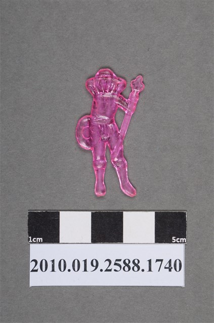 1.本物件為持杵盾人型尪仔仙。硬質塑膠材質,扁平,單一粉紅色,雙面浮雕圖案。正面圖案為造型有寬大立領,手持盾與杵型武器,杵杖頂端有3個角,腳穿靴子的女性人型。2.尪仔仙尺寸大致可分成小、中、大型,小型約長2-5公分,中型約長8-15公分,顏色以單色為主。有些大型的則可長達30公分左右,以菩薩、神仙和民間傳說故事人物等造型為主,塗上金銀紅黃彩漆等亮色。1960、70年代的尪仔仙多以民間傳說故事、歌仔戲、布袋戲人物為造型。1980年代改以卡通、電玩、漫畫人物造型為主。常見玩法之一為兩人(或多人)各持一只尪仔仙,輪流用手指彈射,看誰的尪仔仙先疊在對方上面,便可贏得對方用來對戰或是約定的尪仔仙。