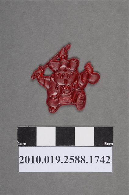 1.本物件為卡通桃太郎傳說之桃太郎尪仔仙。硬質塑膠材質,扁平,單一紅色,雙面浮雕圖案,兩面圖案相同。圖案為跑步的桃太郎,兩邊頭髮往後飛揚,額頭綁有頭帶,正中間有桃子圖案。打扮為日本武士風格,一手舉著劍,一手抓著1袋物品。