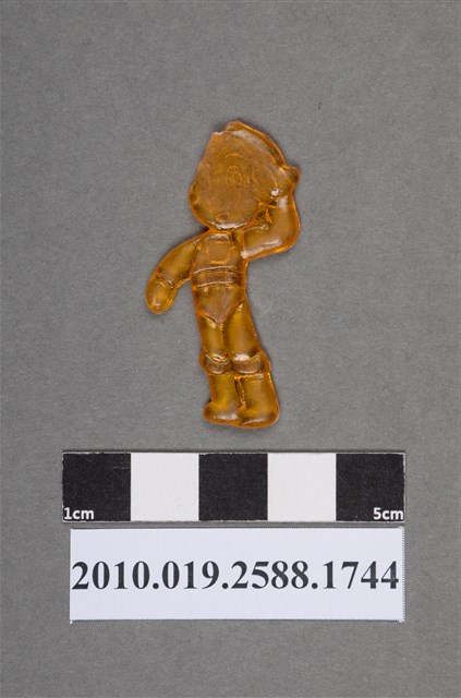 1.本物件為漫畫原子小金剛之小金剛尪仔仙。硬質塑膠材質,扁平,單一橙色,雙面浮雕圖案。正面圖案為敬禮的小金剛,穿有靴子和繫有皮帶,左手往下垂,右手放在太陽穴旁,雙腳併攏,呈敬禮姿勢。胸前有方形圖案,其為掀蓋,在漫畫設定中,打開可見內部機械結構。尪仔仙有破損。