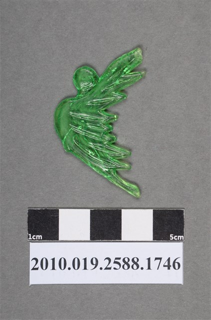 1.本物件為卡通科學小飛俠之鐵雄尪仔仙。硬質塑膠材質,扁平,單一綠色,雙面浮雕圖案。正面圖案為跳飛起來的鐵雄,戴著頭盔,右手揚起鳥羽狀披風,右膝蓋抬起,左腳伸直。