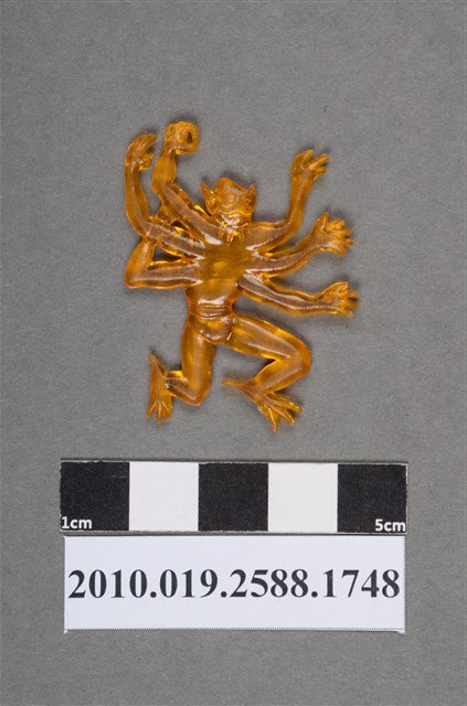 1.本物件為6隻手怪物尪仔仙。硬質塑膠材質,扁平,單一橙色,雙面浮雕圖案。正面圖案為6隻手的人型怪物,其有尖耳和大眼,軀幹左右各有3隻手,每隻手有4-5根手指頭,左右腳掌各長有3根細長腳趾,後腳跟尖細,呈半跪姿。