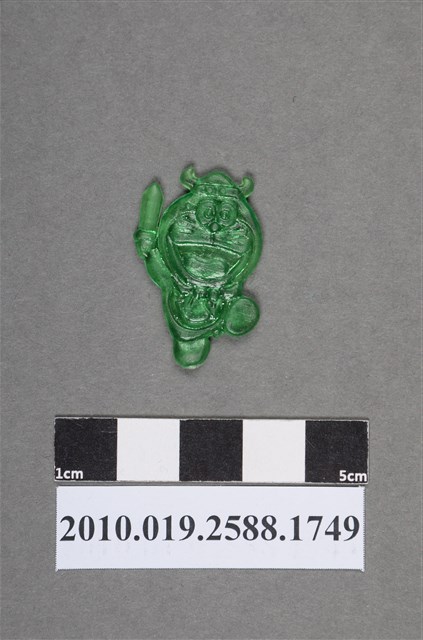 1.本物件為卡通哆啦A夢(小叮噹)之哆啦A夢尪仔仙。硬質塑膠材質,扁平,單一綠色,雙面浮雕圖案,兩面圖案相同。圖案為頭戴維京海盜帽子的哆啦A夢,其張嘴笑,一手高舉著短劍,一腳抬起,呈雀躍貌。