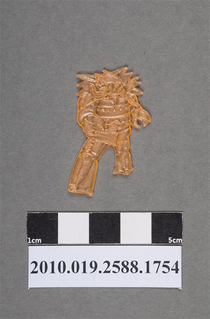 1.本物件為橘色機器人型尪仔仙。硬質塑膠材質,扁平,單一橘色,雙面浮雕圖案,兩面圖案相同。圖案為站立之機器人型,頭部為方型,正前方有長鑽子,兩側邊有彎曲角狀物,頸部有放射狀造型,腰部有皮帶造型,雙手為鉗狀,雙腳底部有凸出鉚釘。2.尪仔仙尺寸大致可分成小、中、大型,小型約長2-5公分,中型約長8-15公分,顏色以單色為主。有些大型的則可長達30公分左右,以菩薩、神仙和民間傳說故事人物等造型為主,塗上金銀紅黃彩漆等亮色。1960、70年代的尪仔仙多以民間傳說故事、歌仔戲、布袋戲人物為造型。1980年代改以卡通、電玩、漫畫人物造型為主。常見玩法之一為兩人(或多人)各持一只尪仔仙,輪流用手指彈射,看誰的尪仔仙先疊在對方上面,便可贏得對方用來對戰或是約定的尪仔仙。