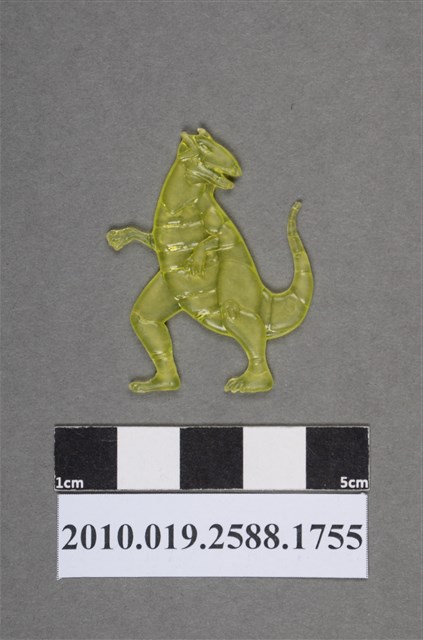1.本物件為黃色恐龍型尪仔仙。硬質塑膠材質,扁平,單一黃色,雙面浮雕圖案,兩面圖案相同。圖案為站立之恐龍型外觀,頭小嘴型長,頭部兩側有7字型的東西,腹部有橫條紋路,上肢短小,下肢粗壯,有長尾巴。2.尪仔仙尺寸大致可分成小、中、大型,小型約長2-5公分,中型約長8-15公分,顏色以單色為主。有些大型的則可長達30公分左右,以菩薩、神仙和民間傳說故事人物等造型為主,塗上金銀紅黃彩漆等亮色。1960、70年代的尪仔仙多以民間傳說故事、歌仔戲、布袋戲人物為造型。1980年代改以卡通、電玩、漫畫人物造型為主。常見玩法之一為兩人(或多人)各持一只尪仔仙,輪流用手指彈射,看誰的尪仔仙先疊在對方上面,便可贏得對方用來對戰或是約定的尪仔仙。