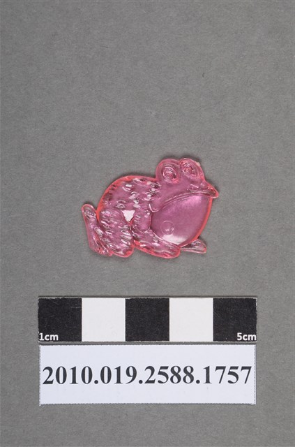 1.本物件為粉紅色蛙型尪仔仙。硬質塑膠材質,扁平,單一粉紅色,雙面浮雕圖案,兩面圖案相同。圖案為蛙型生物,四肢著地,呈趴地姿勢。其有大眼,下巴明顯,身上有點狀斑點分布。2.尪仔仙尺寸大致可分成小、中、大型,小型約長2-5公分,中型約長8-15公分,顏色以單色為主。有些大型的則可長達30公分左右,以菩薩、神仙和民間傳說故事人物等造型為主,塗上金銀紅黃彩漆等亮色。1960、70年代的尪仔仙多以民間傳說故事、歌仔戲、布袋戲人物為造型。1980年代改以卡通、電玩、漫畫人物造型為主。常見玩法之一為兩人(或多人)各持一只尪仔仙,輪流用手指彈射,看誰的尪仔仙先疊在對方上面,便可贏得對方用來對戰或是約定的尪仔仙。