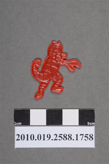 1.本物件為鉗狀手恐龍型尪仔仙。硬質塑膠材質,扁平,單一橘紅色,雙面浮雕圖案。正面圖案為站姿恐龍,手腳有橫條紋路,有長尾巴,雙手為鉗狀。2.尪仔仙尺寸大致可分成小、中、大型,小型約長2-5公分,中型約長8-15公分,顏色以單色為主。有些大型的則可長達30公分左右,以菩薩、神仙和民間傳說故事人物等造型為主,塗上金銀紅黃彩漆等亮色。1960、70年代的尪仔仙多以民間傳說故事、歌仔戲、布袋戲人物為造型。1980年代改以卡通、電玩、漫畫人物造型為主。常見玩法之一為兩人(或多人)各持一只尪仔仙,輪流用手指彈射,看誰的尪仔仙先疊在對方上面,便可贏得對方用來對戰或是約定的尪仔仙。