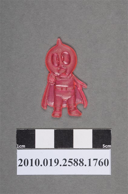1.本物件為披風人型尪仔仙。硬質塑膠材質,扁平,單一粉紅色,雙面浮雕圖案,兩面圖案相同。圖案為戴著面具型頭盔遮住全頭部,頭盔正中間有尖角,服裝有披風和腰帶之站立人型。其眼睛呈橢圓形,一手往前指,一手垂放。2.尪仔仙尺寸大致可分成小、中、大型,小型約長2-5公分,中型約長8-15公分,顏色以單色為主。有些大型的則可長達30公分左右,以菩薩、神仙和民間傳說故事人物等造型為主,塗上金銀紅黃彩漆等亮色。1960、70年代的尪仔仙多以民間傳說故事、歌仔戲、布袋戲人物為造型。1980年代改以卡通、電玩、漫畫人物造型為主。常見玩法之一為兩人(或多人)各持一只尪仔仙,輪流用手指彈射,看誰的尪仔仙先疊在對方上面,便可贏得對方用來對戰或是約定的尪仔仙。