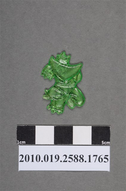 1.本物件為綠色機器人型尪仔仙。硬質塑膠材質,扁平,單一綠色,雙面浮雕圖案。正面圖案為獸面機器人型,臉部有尖嘴,胸前有大V字型裝飾,一手握拳,一手撐住地上,呈蹲姿。2.尪仔仙尺寸大致可分成小、中、大型,小型約長2-5公分,中型約長8-15公分,顏色以單色為主。有些大型的則可長達30公分左右,以菩薩、神仙和民間傳說故事人物等造型為主,塗上金銀紅黃彩漆等亮色。1960、70年代的尪仔仙多以民間傳說故事、歌仔戲、布袋戲人物為造型。1980年代改以卡通、電玩、漫畫人物造型為主。常見玩法之一為兩人(或多人)各持一只尪仔仙,輪流用手指彈射,看誰的尪仔仙先疊在對方上面,便可贏得對方用來對戰或是約定的尪仔仙。