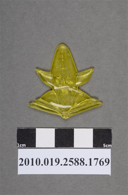 1.本物件為長下巴頭像尪仔仙。硬質塑膠材質,扁平,單一黃色,雙面浮雕圖案。正面圖案為長臉頭像,頭頂尖長,尖耳且外擴,長下巴,下巴底下可見服裝的一部分。2.尪仔仙尺寸大致可分成小、中、大型,小型約長2-5公分,中型約長8-15公分,顏色以單色為主。有些大型的則可長達30公分左右,以菩薩、神仙和民間傳說故事人物等造型為主,塗上金銀紅黃彩漆等亮色。1960、70年代的尪仔仙多以民間傳說故事、歌仔戲、布袋戲人物為造型。1980年代改以卡通、電玩、漫畫人物造型為主。常見玩法之一為兩人(或多人)各持一只尪仔仙,輪流用手指彈射,看誰的尪仔仙先疊在對方上面,便可贏得對方用來對戰或是約定的尪仔仙。