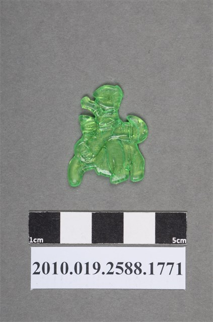 1.本物件為卡通淘氣阿丹之阿丹尪仔仙。硬質塑膠材質,扁平,單一綠色,雙面浮雕圖案。正面圖案為阿丹騎在他的寵物狗長毛的背上,阿丹右手握拳往前伸,左手抓著長毛。在卡通設定中,長毛是白色大狗。
