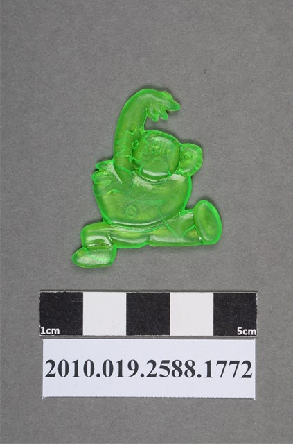 1.本物件為漫畫原子小金剛之御茶水博士尪仔仙。硬質塑膠材質,扁平,單一綠色,雙面浮雕圖案。正面圖案為御茶水博士做體操的樣子,禿頭,耳朵旁有頭髮,招牌是大鼻子。其左手往上舉,手掌側彎,右手從胸前橫過,左腳蹲馬步,右腳往旁邊平伸。在漫畫設定中,御茶水博士十分照顧主角小金剛,兩人有父子之情。