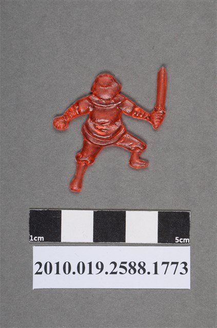 1.本物件為持刀人型尪仔仙。硬質塑膠材質,扁平,單一橘紅色,雙面浮雕圖案。正面圖案為呈戰鬥姿勢的男性,其頭戴頭盔,左手握拳,右手握著刀,刀尖往上舉,左腳斜伸,右膝彎曲。2.尪仔仙尺寸大致可分成小、中、大型,小型約長2-5公分,中型約長8-15公分,顏色以單色為主。有些大型的則可長達30公分左右,以菩薩、神仙和民間傳說故事人物等造型為主,塗上金銀紅黃彩漆等亮色。1960、70年代的尪仔仙多以民間傳說故事、歌仔戲、布袋戲人物為造型。1980年代改以卡通、電玩、漫畫人物造型為主。常見玩法之一為兩人(或多人)各持一只尪仔仙,輪流用手指彈射,看誰的尪仔仙先疊在對方上面,便可贏得對方用來對戰或是約定的尪仔仙。