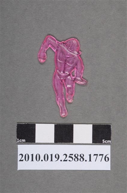 1.本物件為伸手人型尪仔仙。硬質塑膠材質,扁平,單一粉紅色,雙面浮雕圖案。正面圖案為彎腰跑步之人型,可見腿部肌肉線條,戴著頭盔,左手往後擺,右手往下伸,有抓取物品之貌。2.尪仔仙尺寸大致可分成小、中、大型,小型約長2-5公分,中型約長8-15公分,顏色以單色為主。有些大型的則可長達30公分左右,以菩薩、神仙和民間傳說故事人物等造型為主,塗上金銀紅黃彩漆等亮色。1960、70年代的尪仔仙多以民間傳說故事、歌仔戲、布袋戲人物為造型。1980年代改以卡通、電玩、漫畫人物造型為主。常見玩法之一為兩人(或多人)各持一只尪仔仙,輪流用手指彈射,看誰的尪仔仙先疊在對方上面,便可贏得對方用來對戰或是約定的尪仔仙。