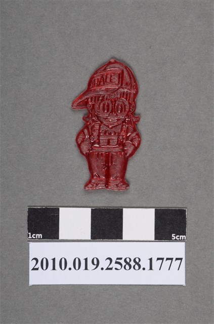 1.本物件為漫畫怪博士與機器娃娃之阿拉蕾(丁小雨)尪仔仙。硬質塑膠材質,扁平,單一不透明紅色,雙面浮雕圖案,兩面圖案相同。圖案為小女孩人型,張嘴笑,戴著帽子和眼鏡,帽上有「ARALE」字樣,穿著吊帶褲,雙手插在口袋。