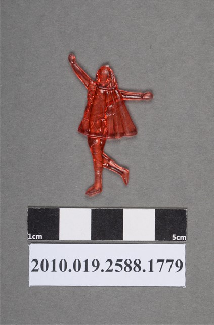 1.本物件為披風人型尪仔仙。硬質塑膠材質,扁平,單一紅色,雙面浮雕圖案。正面圖案為單腳站立的女性,穿有披風,胸前有S字,雙手伸展,左腳站立,右膝蓋彎曲,為女超人形象。2.尪仔仙尺寸大致可分成小、中、大型,小型約長2-5公分,中型約長8-15公分,顏色以單色為主。有些大型的則可長達30公分左右,以菩薩、神仙和民間傳說故事人物等造型為主,塗上金銀紅黃彩漆等亮色。1960、70年代的尪仔仙多以民間傳說故事、歌仔戲、布袋戲人物為造型。1980年代改以卡通、電玩、漫畫人物造型為主。常見玩法之一為兩人(或多人)各持一只尪仔仙,輪流用手指彈射,看誰的尪仔仙先疊在對方上面,便可贏得對方用來對戰或是約定的尪仔仙。