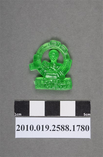 1.本物件為電玩遊戲銀河戰士之銀河戰士尪仔仙。硬質塑膠材質,扁平,單一紅色,雙面浮雕圖案,兩面圖案相同。圖案為銀河戰士,人頭像框在圓圈中,圓圈表面有方塊形狀排列,圓圈有底座,底座上有「銀河戰士」字樣。