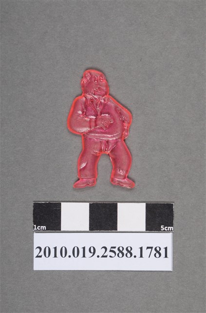 1.本物件為卡通淘氣阿丹之威爾森先生尪仔仙。硬質塑膠材質,扁平,單一粉紅色,雙面浮雕圖案,兩面圖案相同。圖案為男性形象,禿頭,鼻子比例大,身穿襯衫,肚子挺出,一手插腰,右手抬起至腹前,呈站立貌。