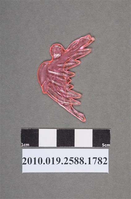 1.本物件為卡通科學小飛俠之鐵雄尪仔仙。硬質塑膠材質,扁平,單一紅色,雙面浮雕圖案。正面圖案為跳飛起來的鐵雄,戴著頭盔,右手揚起鳥羽狀披風,右膝蓋抬起,左腳伸直。