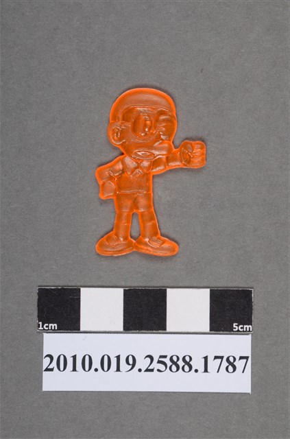 1.本物件為卡通哆啦A夢(小叮噹)之大雄(野比大雄)尪仔仙。硬質塑膠材質,扁平,單一橘色,雙面浮雕圖案,兩面圖案相同。圖案為戴著眼鏡的大雄,一眼張開,一眼瞇著,嘴巴嘟起來,頸部綁有蝴蝶結,穿短褲。其為站立姿勢,一手伸出握拳,另一手放腰間。