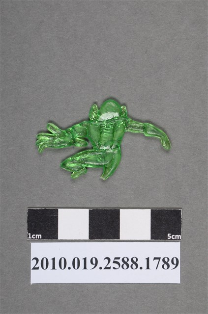 1.本物件為綠色人型尪仔仙。硬質塑膠材質,扁平,單一綠色,雙面浮雕圖案。正面圖案為跳躍的男性,其頭戴頭盔,嘴巴張開,一手往前伸,手掌張開,另一隻手往側邊伸,雙腳彎曲。尪仔仙有破損,有一邊的腳掌斷掉。2.尪仔仙尺寸大致可分成小、中、大型,小型約長2-5公分,中型約長8-15公分,顏色以單色為主。有些大型的則可長達30公分左右,以菩薩、神仙和民間傳說故事人物等造型為主,塗上金銀紅黃彩漆等亮色。1960、70年代的尪仔仙多以民間傳說故事、歌仔戲、布袋戲人物為造型。1980年代改以卡通、電玩、漫畫人物造型為主。常見玩法之一為兩人(或多人)各持一只尪仔仙,輪流用手指彈射,看誰的尪仔仙先疊在對方上面,便可贏得對方用來對戰或是約定的尪仔仙。