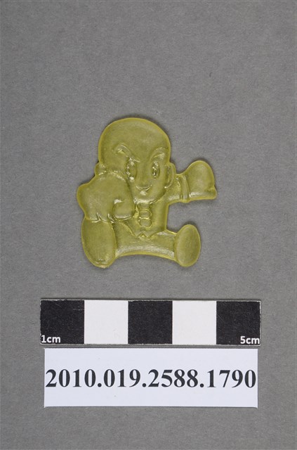 1.本物件為拳擊人型尪仔仙。硬質塑膠材質,扁平,單一黃色,雙面浮雕圖案,兩面圖案相同。圖案為光頭男生,眉毛明顯,呈坐姿,雙手握拳,有一拳往前擊。2.尪仔仙尺寸大致可分成小、中、大型,小型約長2-5公分,中型約長8-15公分,顏色以單色為主。有些大型的則可長達30公分左右,以菩薩、神仙和民間傳說故事人物等造型為主,塗上金銀紅黃彩漆等亮色。1960、70年代的尪仔仙多以民間傳說故事、歌仔戲、布袋戲人物為造型。1980年代改以卡通、電玩、漫畫人物造型為主。常見玩法之一為兩人(或多人)各持一只尪仔仙,輪流用手指彈射,看誰的尪仔仙先疊在對方上面,便可贏得對方用來對戰或是約定的尪仔仙。