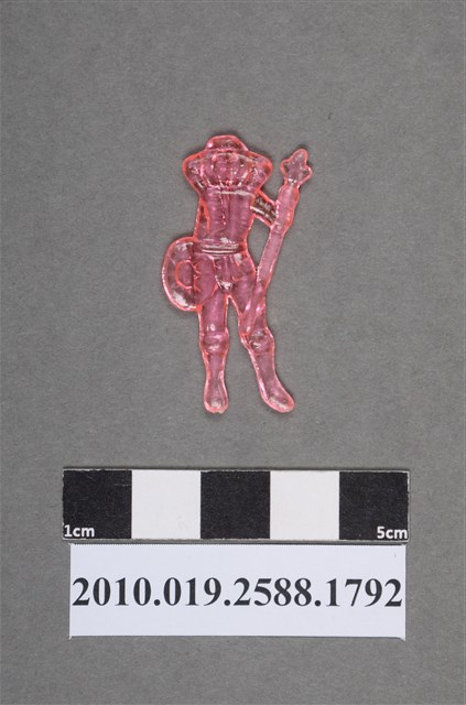 1.本物件為持杵盾人型尪仔仙。硬質塑膠材質,扁平,單一粉紅色,雙面浮雕圖案。正面圖案為造型有寬大立領,手持盾與杵型武器,杵杖頂端有3個角,腳穿靴子的女性人型。2.尪仔仙尺寸大致可分成小、中、大型,小型約長2-5公分,中型約長8-15公分,顏色以單色為主。有些大型的則可長達30公分左右,以菩薩、神仙和民間傳說故事人物等造型為主,塗上金銀紅黃彩漆等亮色。1960、70年代的尪仔仙多以民間傳說故事、歌仔戲、布袋戲人物為造型。1980年代改以卡通、電玩、漫畫人物造型為主。常見玩法之一為兩人(或多人)各持一只尪仔仙,輪流用手指彈射,看誰的尪仔仙先疊在對方上面,便可贏得對方用來對戰或是約定的尪仔仙。